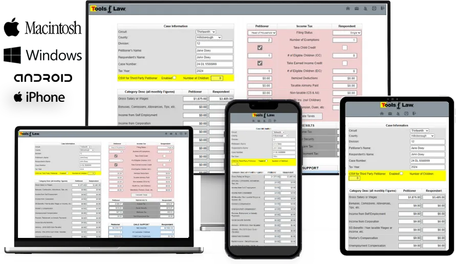 Trusted and used daily in 5 of Florida’s 20 judicial circuits, our child support software has now fully transitioned to the cloud — giving you secure access from any device: PC, Mac, iPhone, Android, and your Tablet. If you have a browser, you have access to your Tools for Law.